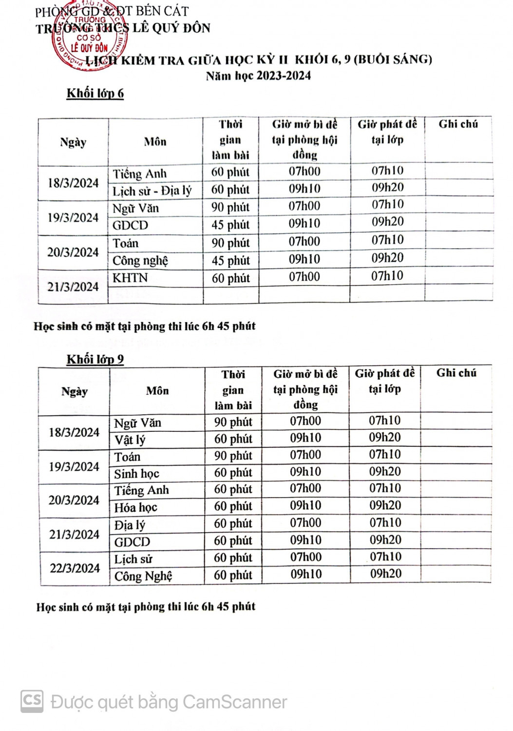 Lịch kiểm tra giữa kỳ 2 năm học 2023-2024